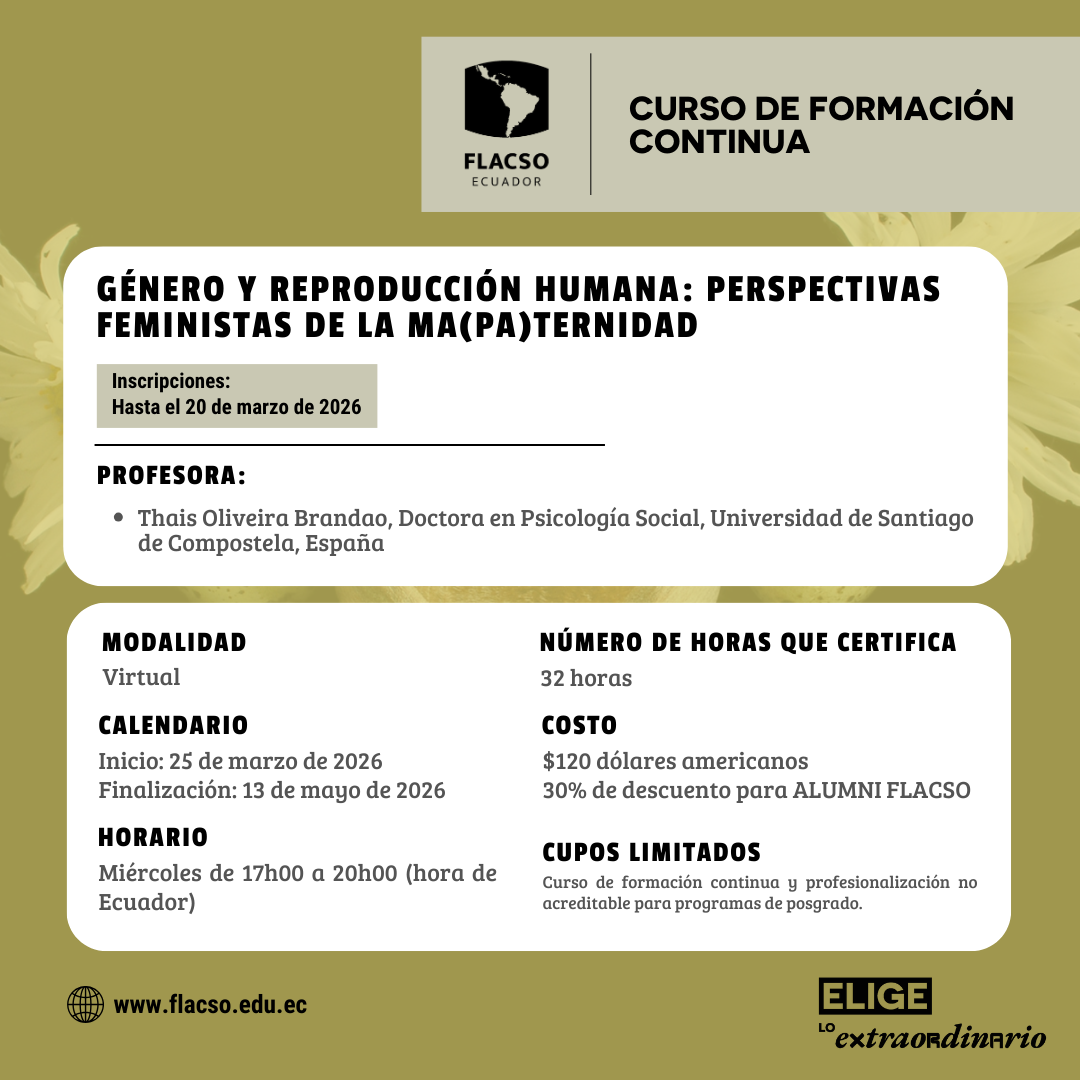 El curso articula aportes de la epistemología feminista, la perspectiva de género, los derechos humanos y la antropología médica latinoamericana, con énfasis en la interseccionalidad. Politizar la maternidad implica situarla en el centro de las ciencias sociales, cuestionando un sistema que romantiza y desvaloriza el trabajo reproductivo y de cuidados, y denunciando las violencias estructurales que marcan la experiencia materna contemporánea.