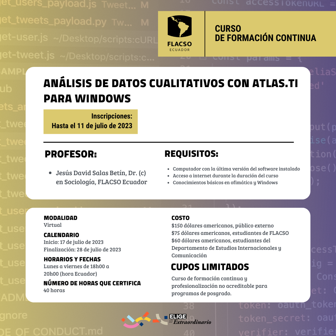ATLAS.ti es un software para análisis de datos cualitativos asistido por computadora (CAQDAS, por sus siglas en inglés), que permite trabajar con archivos de texto, videos, audios e imágenes, facilitando el proceso de investigación en relación con la organización, búsqueda, categorización y análisis de grandes volúmenes de información. El curso busca familiarizar a los y las participantes con las principales herramientas del software en su versión para el sistema operativo Windows. En cada sesión, los y las participantes adquirirán un conjunto de instrumentos para el apoyo, organización y análisis de datos, mediante el uso y aplicación de las herramientas y utilidades que ofrece este software. A su vez, se introducirán algunos conceptos básicos de metodología de investigación cualitativa que se articulan el desarrollo y aplicación de esta herramienta. Se espera que al final los y las participantes sean capaces de adaptar el uso del software a trabajo cotidiano, mediante la comprensión teórica y práctica de sus componentes básicos.